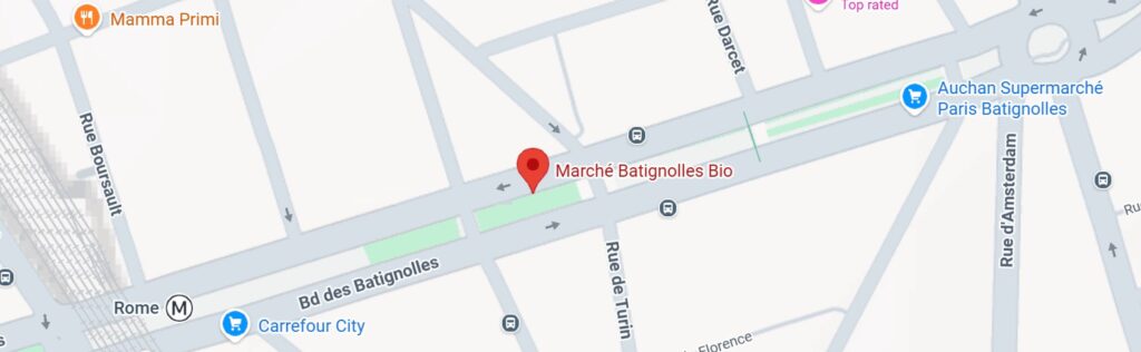 Dagelijkse markt in Batignolles vind je op de Rue de Levis, net als de Rue Mouffetard een straatmarkt. (Over de Rue de Levis op Perraudin in Parijs >>>) Op de Rue Demoines/ Rue Lemercier vind je de overdekte markt van Batignolles (Marché couvert Batignolles: info website Paris.fr >>> )